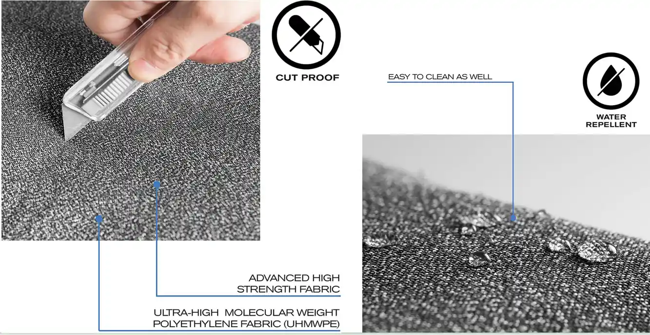 We reinforce key areas with cutproof webbing, strengthening edges, load zones, and connection points. Combined with the UHMWPE fabric, this creates a continuous anti-cut structure with no obvious weak spots.